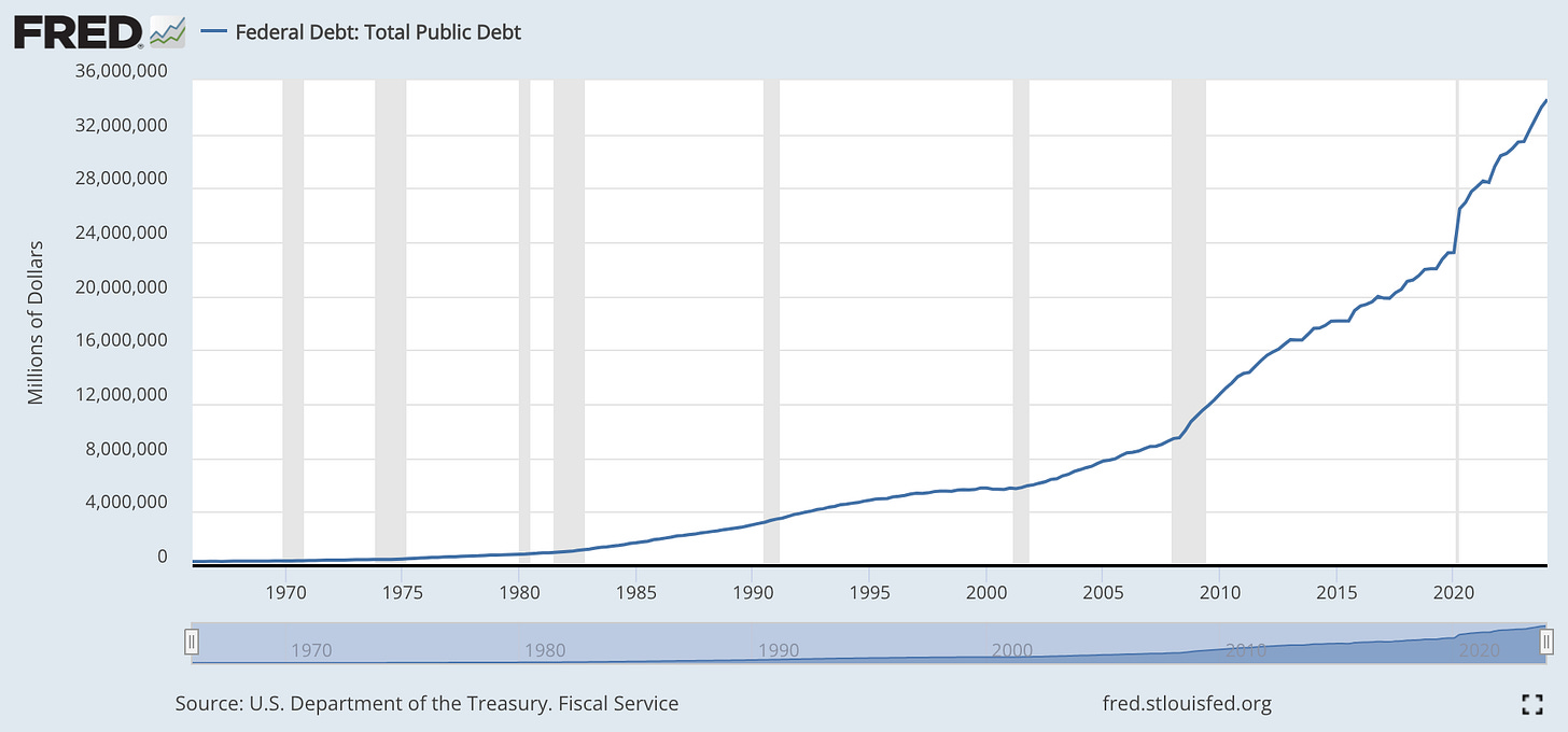 The national debt (now $35 trillion) has been the elephant in the room for a long time, but my goodness, it’s ballooned since the pandemic. Most everything else in the news just feels like noise.